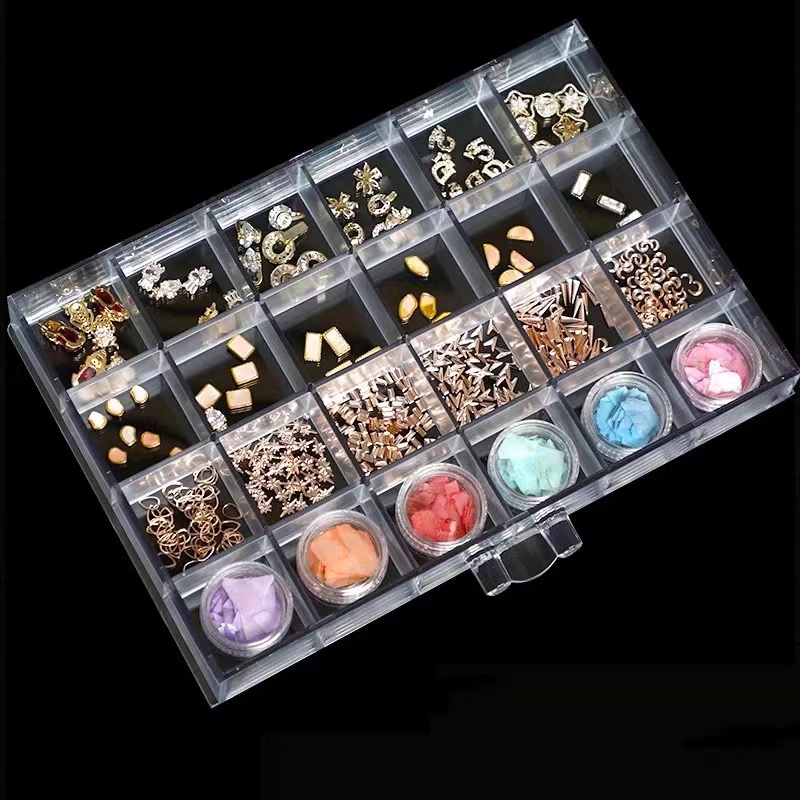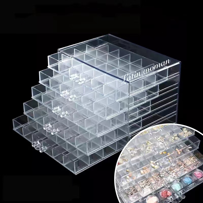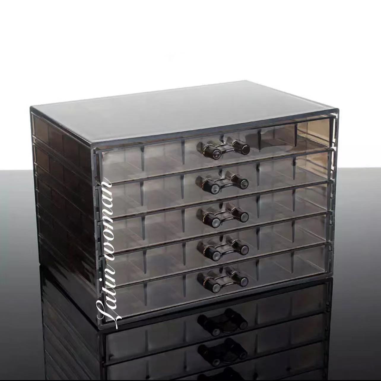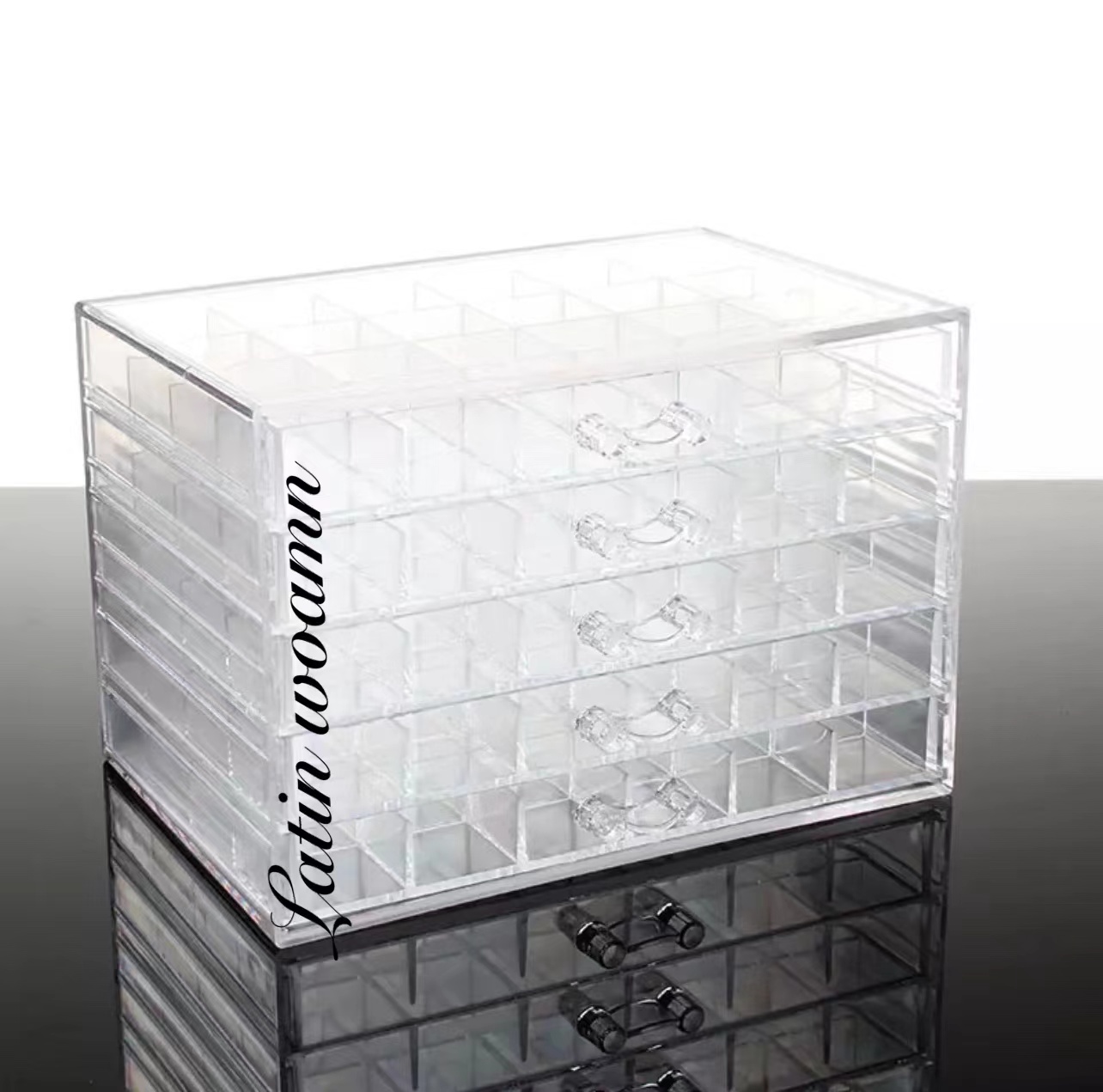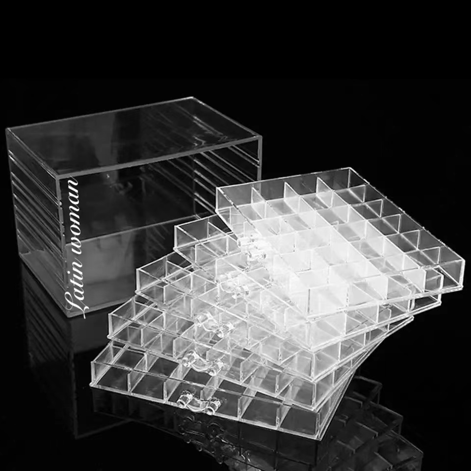 organizador en acrÃlico diseñado especialmente para almacenar cristalerÃa y decoraciónes de uñas cuenta con 5 cajoneras, cada una con 24 compartimentos fijos. material: acrilico. medidas:21.5×14.5x cm aprox. disponible: transparente, negro y blanco. si optas por algún color en especial indÃcalo en observaciones al final del pedido y este será enviado siempre y cuando quede stock.