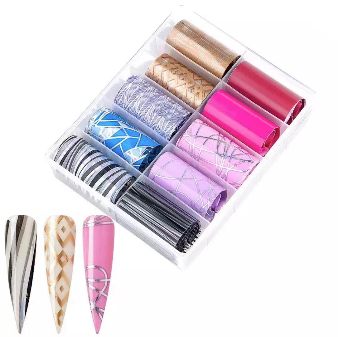 el foil sirve para la decoración de uñas. Estas láminas de papel con diferentes diseños se pueden recortar y personalizar para transferir sobre las uñas con sorprendentes diseños , tanto planos como en relieve. debe relazarse con un pegamento especial que tenga una capa de adherencia.