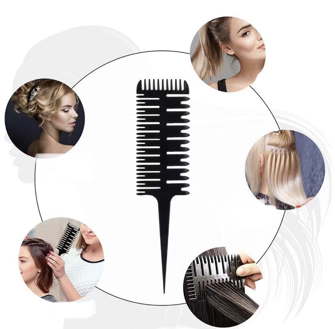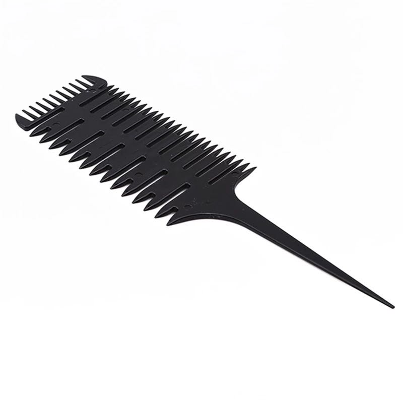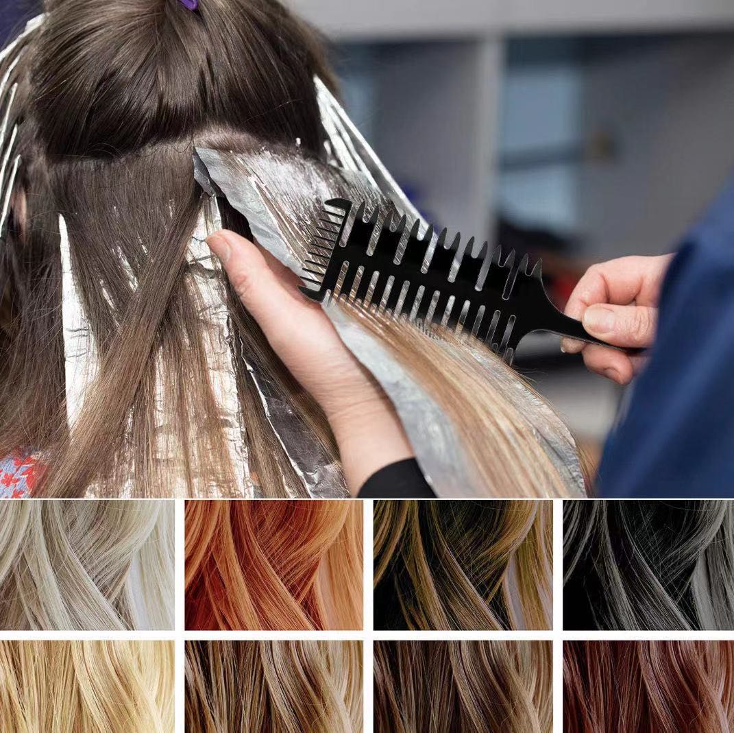 Este peine tiene 3 de sus lados con diferentes dientes lo cual nos permite a la hora de realizar el trabajo mas opciones, obteniendo los reflejos mas gruesos o delgados. descripción material: plástico color: negro medidas: 23.5 cm x 6 cm cantidad: 1 pcs